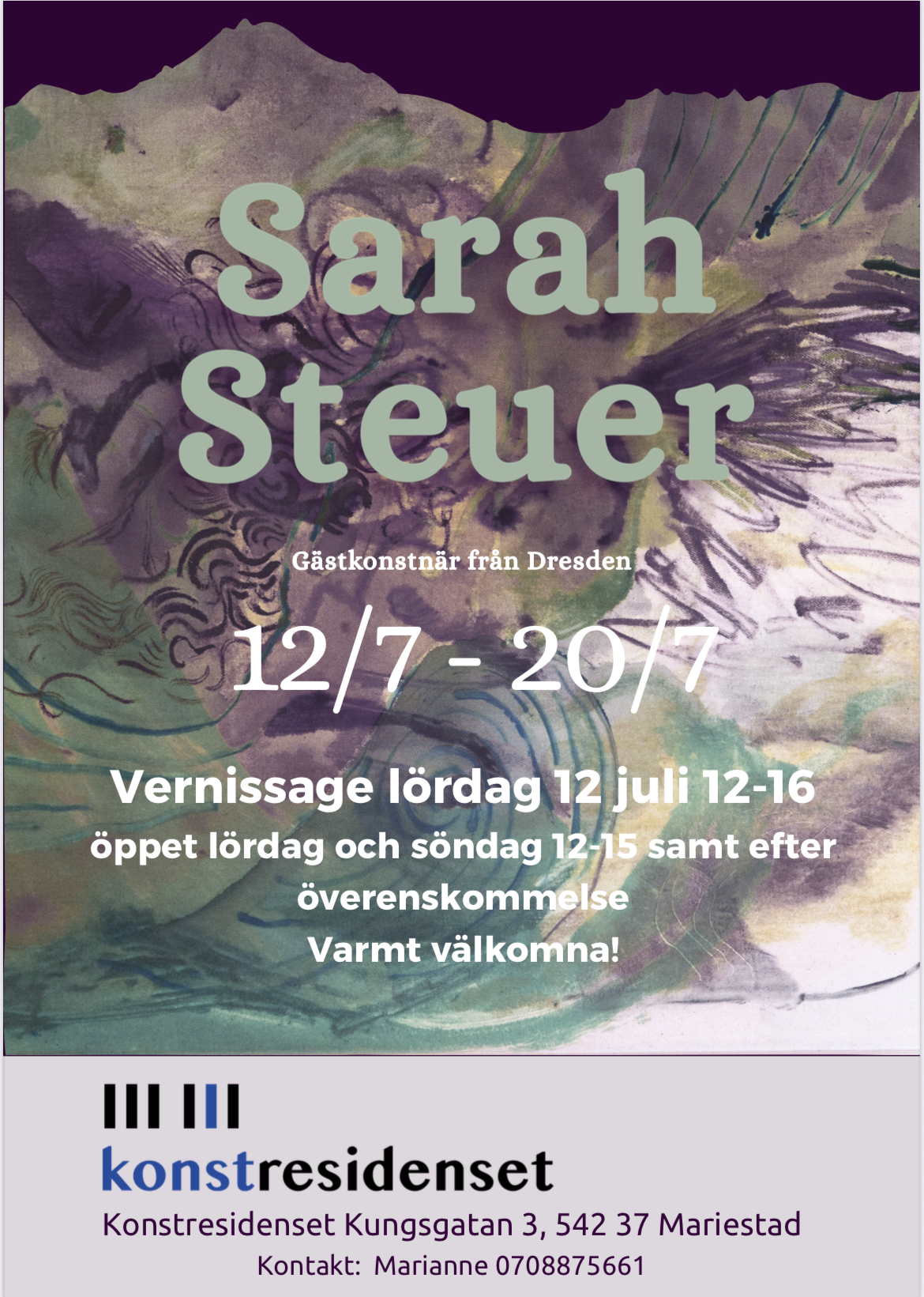 Sarah Steuer konstnär från Dresden visar unik grafik och måleri i Konstresidenset. Sarah är utbildad på konstakademin i Dresden och visar en spännande mytisk bildvärld. Varmt välkommen in!